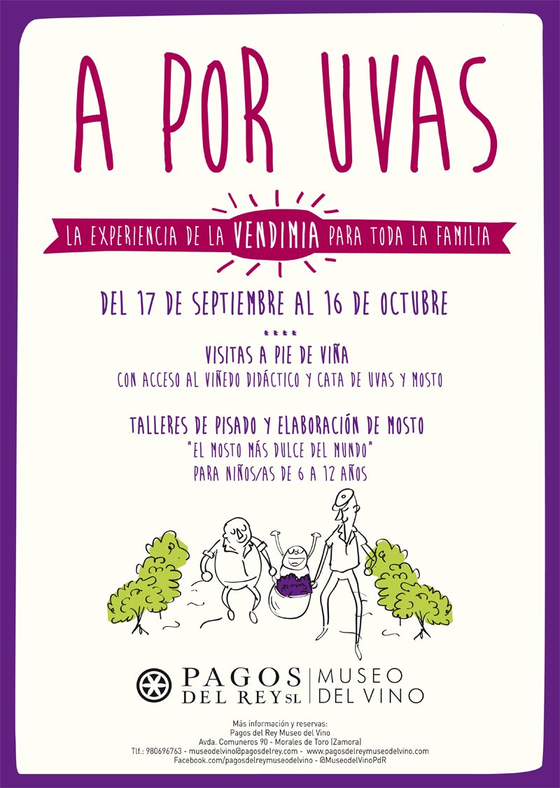 La época de la vendimia, durante los meses de septiembre y octubre, es el periodo del año que mayor interés suscita para los enoturistas y visitantes de bodegas. Con motivo de la llegada de la uva a Pagos del Rey, el Museo del Vino ha programado un ciclo de actividades especiales para esta época de recolección bajo el nombre de “A por Uvas”. La uva, en las cuatro variedades admitidas por la Denominación de Origen Toro: Malvasía, Verdejo, Garnacha y Tinta de Toro, es la gran protagonista del museo durante este tiempo y las propuestas diseñadas para estos meses van encaminadas hacia la didáctica del proceso del ciclo de la planta y el acercamiento al conocimiento del fruto.